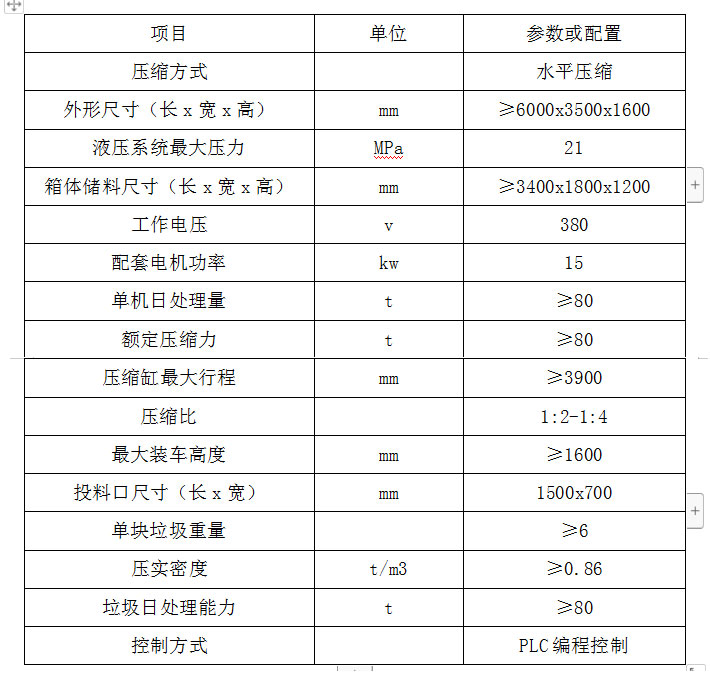 ◇全封閉水平壓縮:采用水平壓縮方式,垃圾壓縮密度≥0.86t/m3,垃圾壓縮后體積大大減小,從而大幅度提高轉(zhuǎn)運(yùn)車輛裝載量和轉(zhuǎn)運(yùn)效率,降低垃圾處理、轉(zhuǎn)運(yùn)等費(fèi)用;